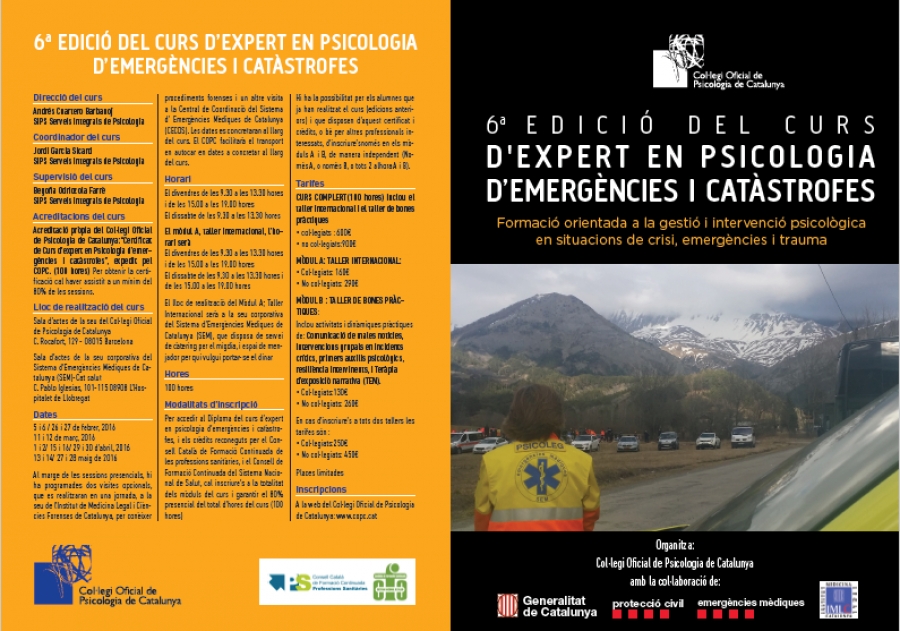 Enguany el Col.legi de Psicologia de Catalunya farà la VI edició del curs d'expert en psicologia d'emergències i catàstrofes, una disciplina de la psicologia aplicada en crisis i emergències, que cada vegada té mes ressó i es fa necessaria davant esdeveniments traumàtics.